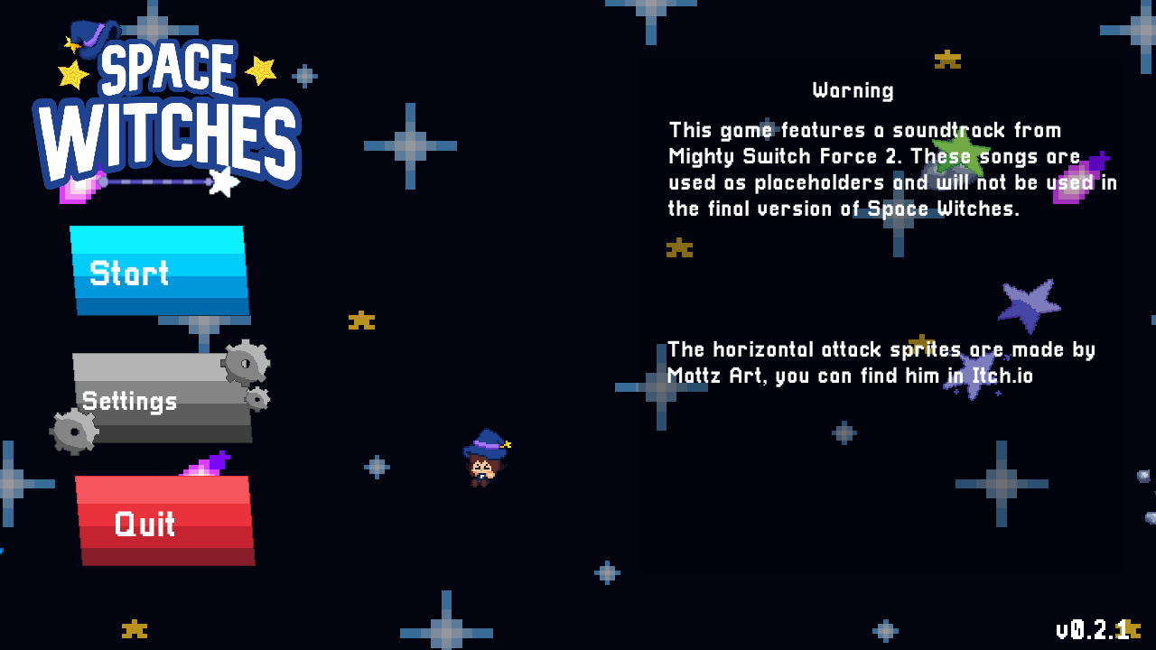 This game features a soundtrack from Mighty Switch Force 2. These songs are used as placeholders and will not be used in the final version of Space Witches.